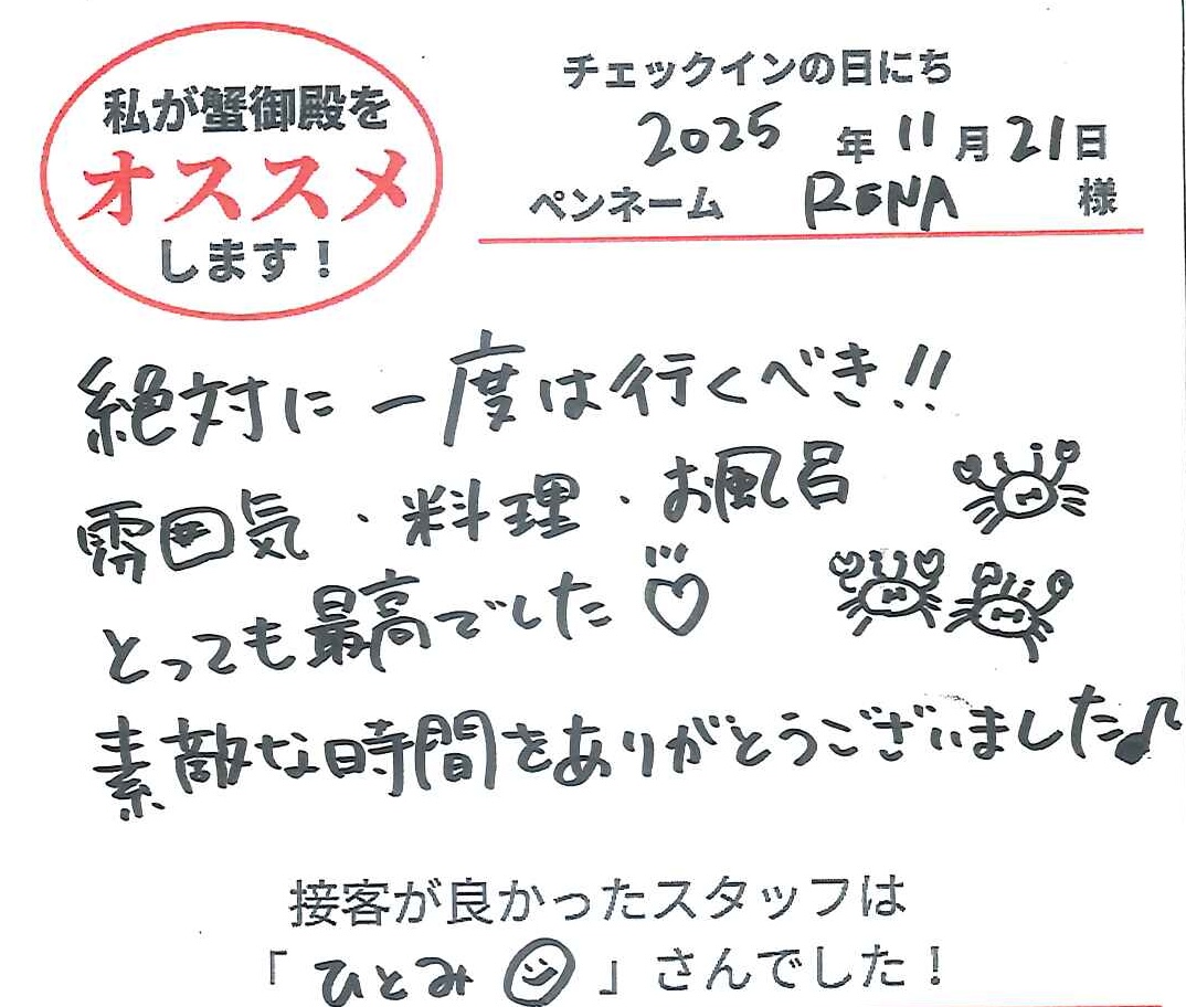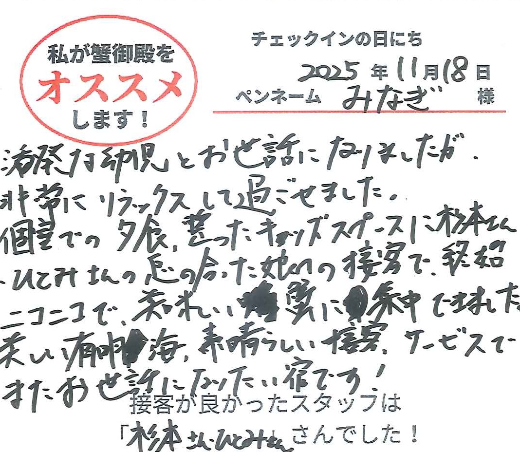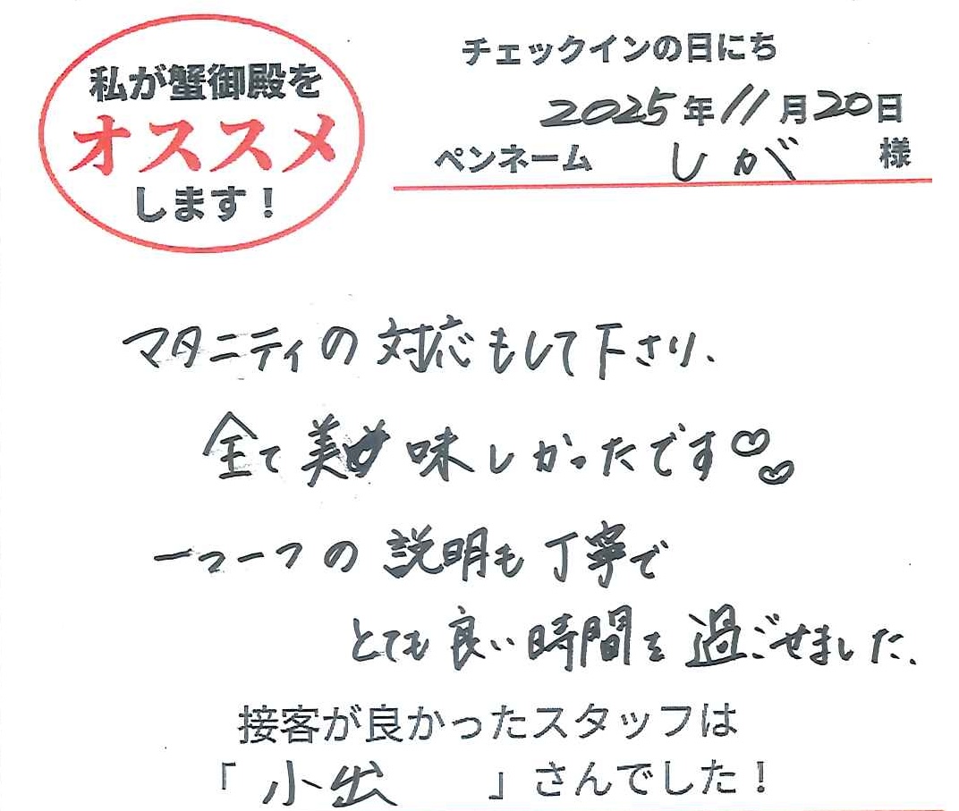 2025年11月20日ご宿泊 ペンネーム「しが」様View More