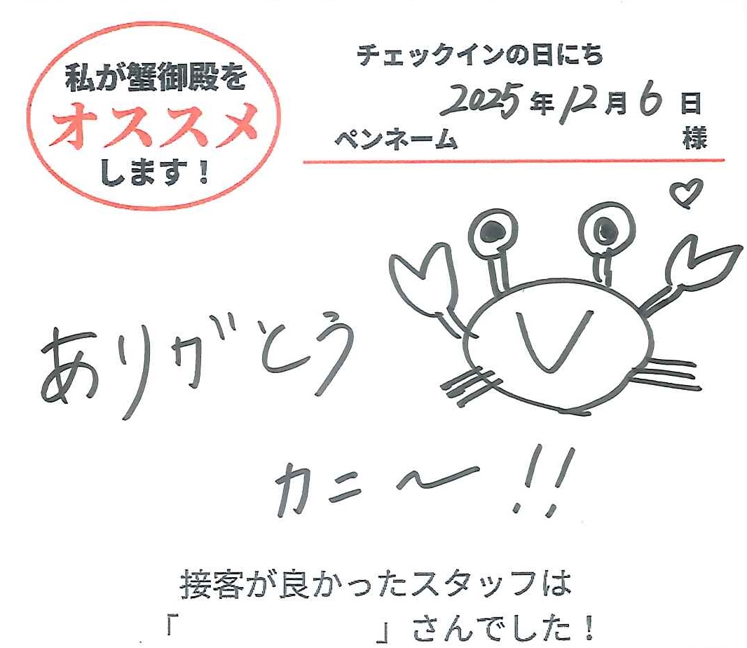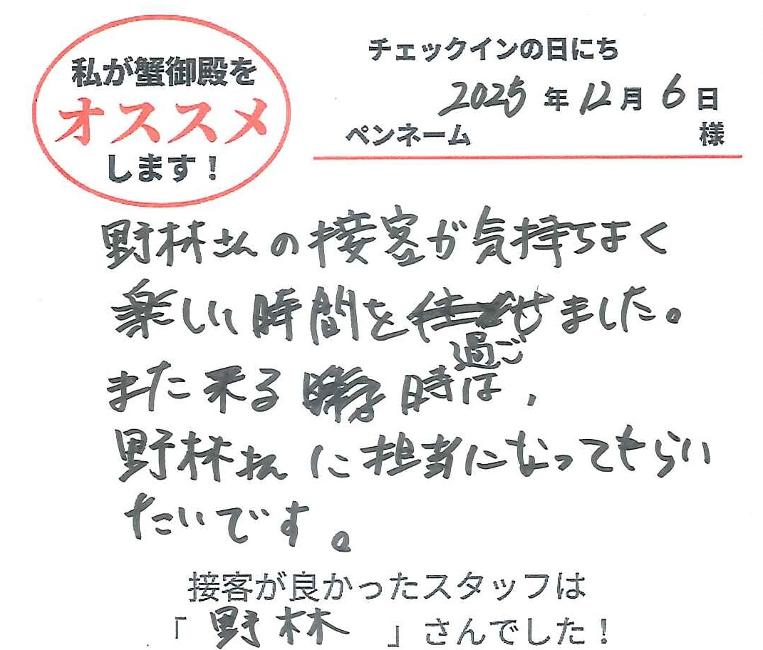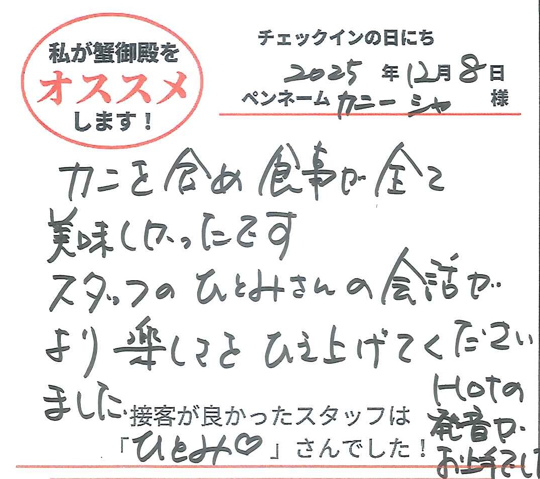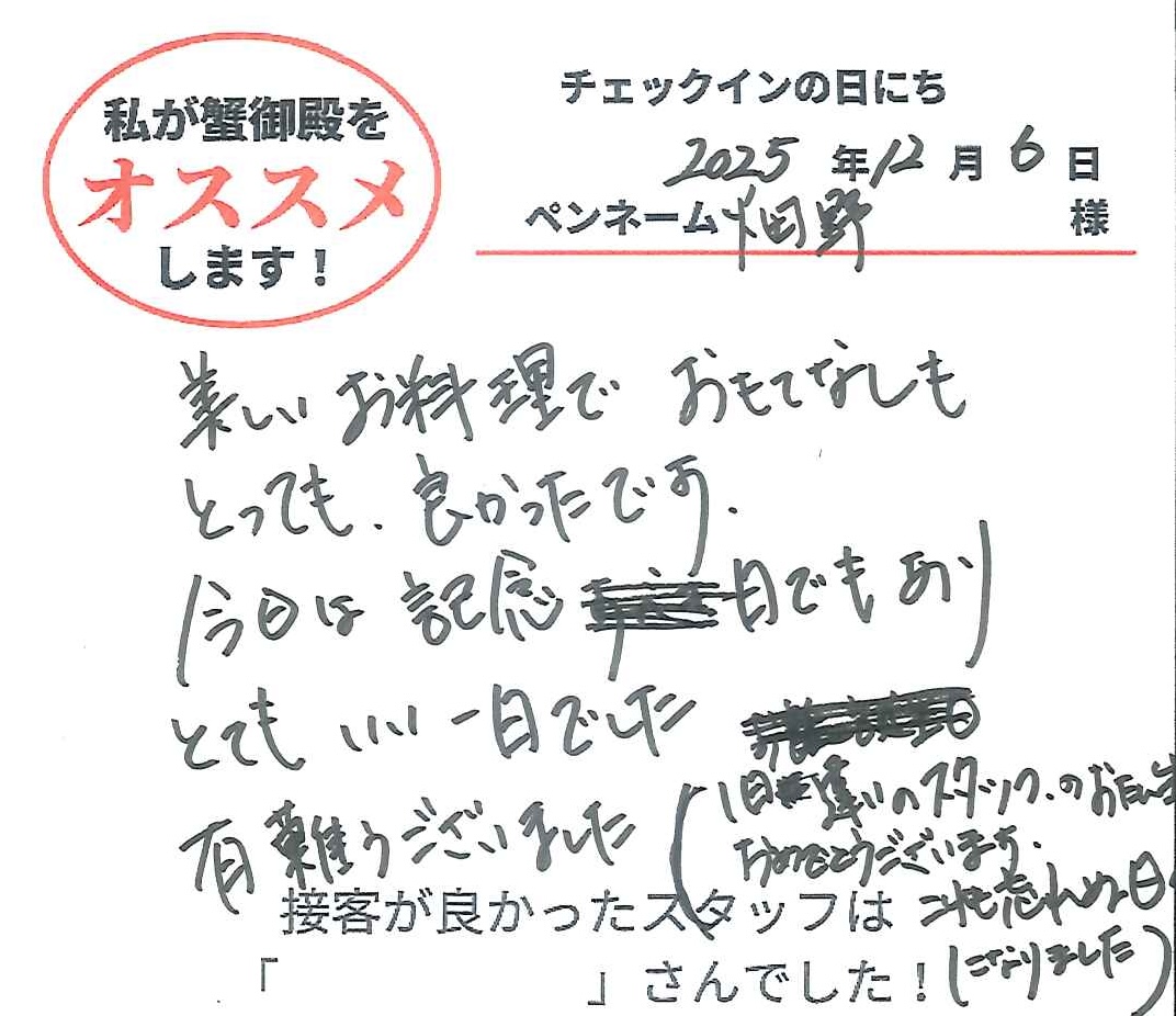 2025年12月8日ご宿泊 ペンネーム「カニーシャ」様View More